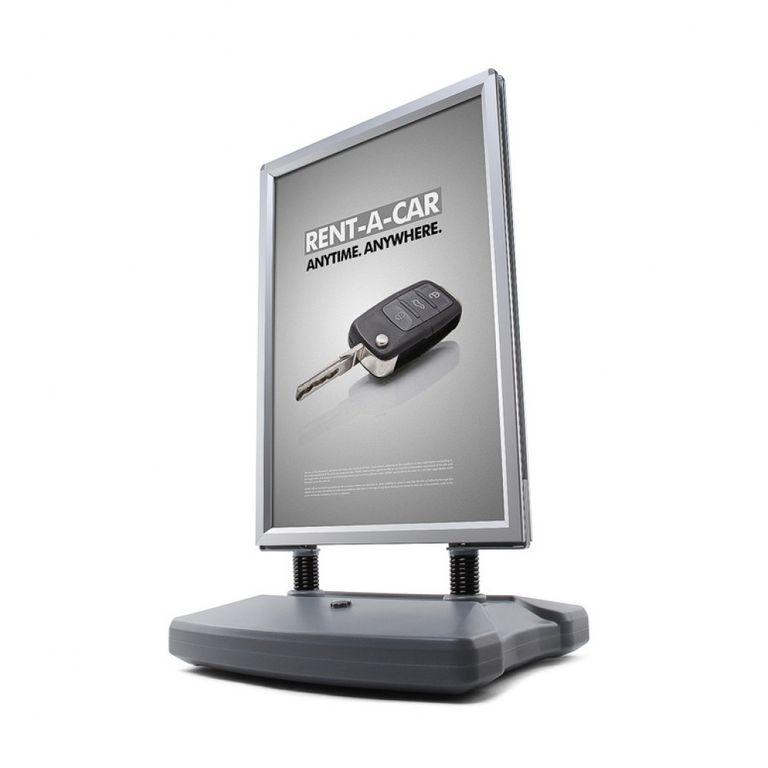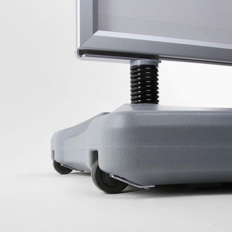 Speziell für Ihre Werbung in windigen Bereichen ist der Kundenstopper WINDTALKER® von Werbetechnik Lehner in Ziemetshausen die optimale Lösung. Sein mit Wasser oder Sand befüllbarer Standfuß bietet in Verbindung mit den Spezialfedern aus Stahl eine hohe Standfestigkeit. Für den einfachen Transport sind im Standfuß Rollen integriert. So können Sie den Kundenstopper trotz des Standgewichtes einfach bewegen. Der Aluminium-Schnellwechselrahmen kann doppelseitig mit Plakaten bestückt werden und garantiert Ihnen auch bei hohen Windstärken eine auffällige Werbemöglichkeit.